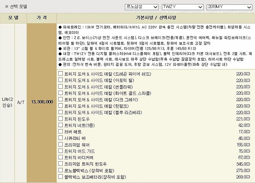 ▶ 차종 및 등급 : 르노삼성 TWIZY [2020MY] / LIFE 2인승