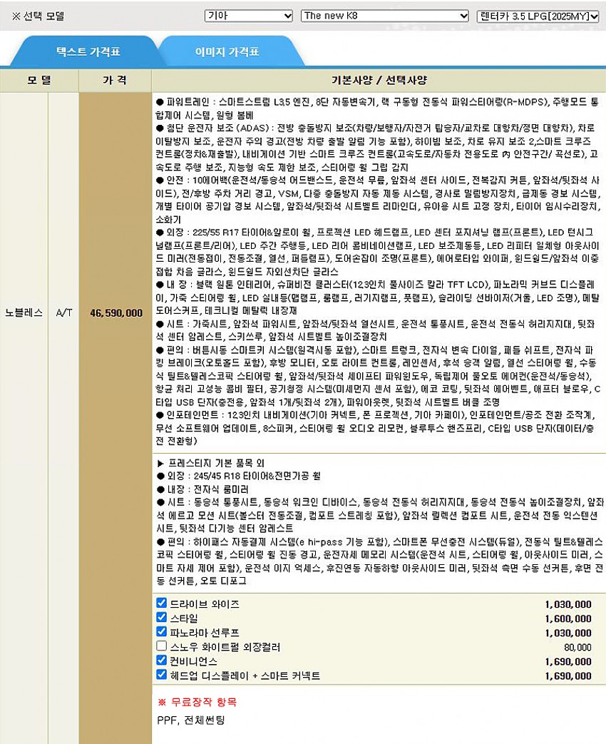 ▶ 차종 및 등급 : 더 뉴 K8_렌터카_3.5 LPG_노블레스_25MY