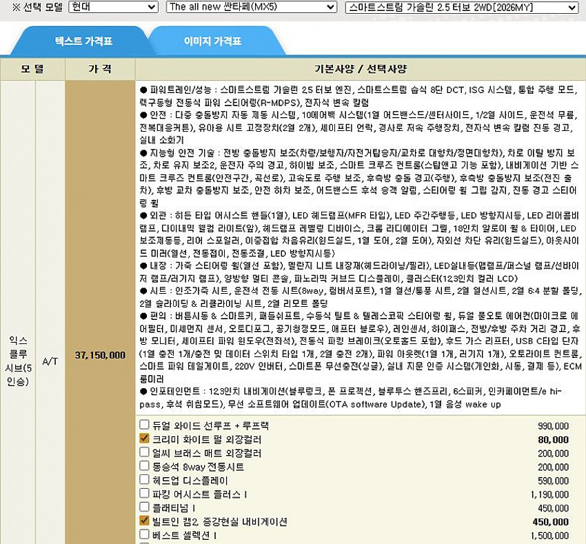 ▶ 차종 및 등급 : 싼타페 가솔린 2.5T_2WD_익스클루시브(5인승)_26MY
