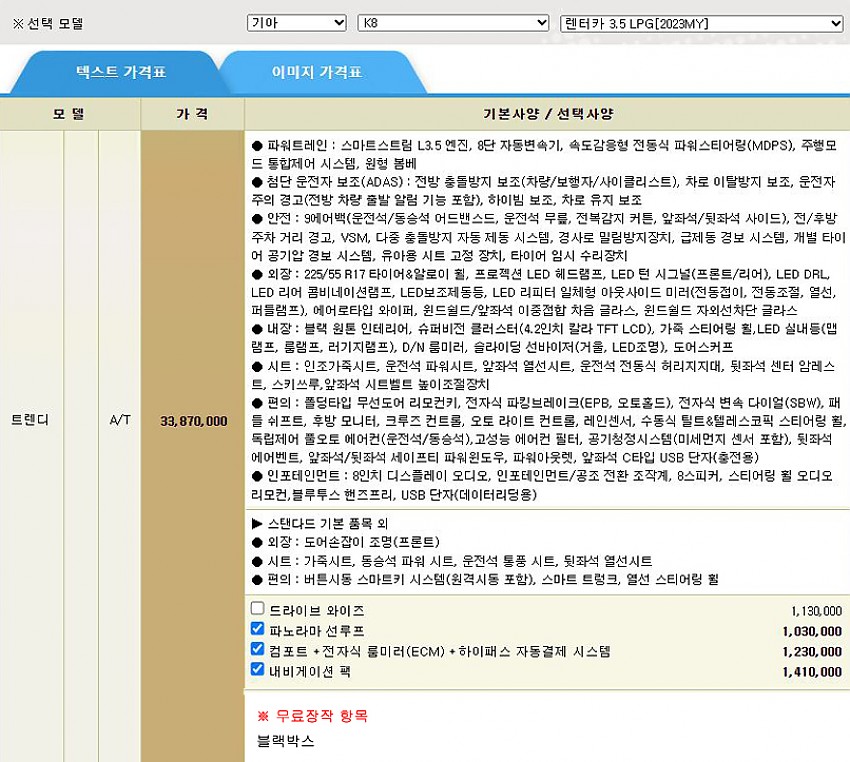 ▶ 차종 및 등급 : 기아 K8 렌터카 3.5 LPG / 트렌디 2023MY