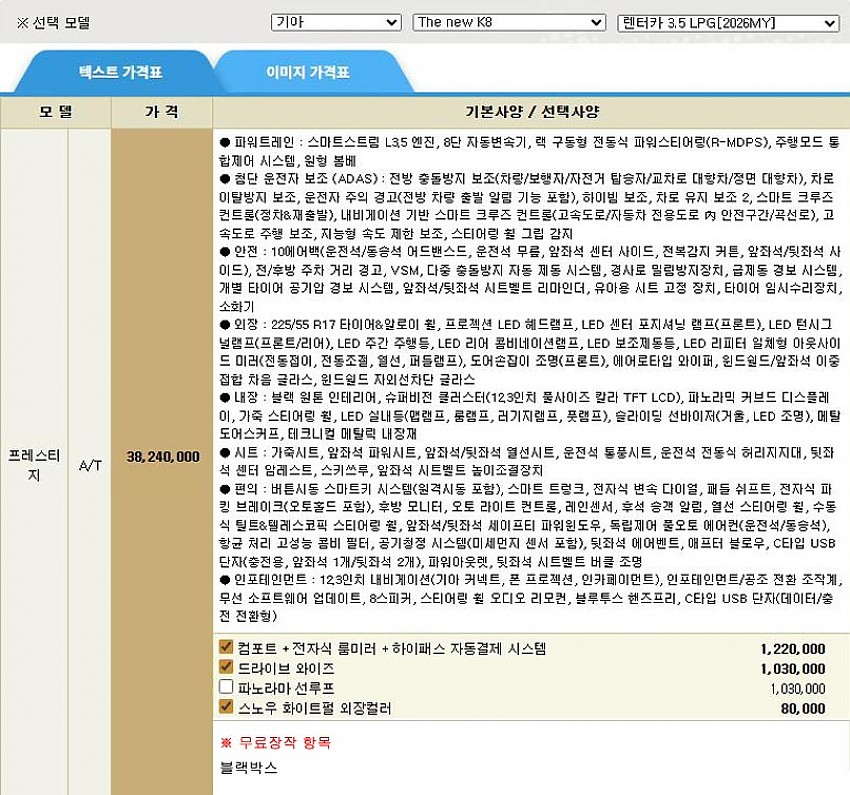 ▶ 차종 및 등급 : 더 뉴 K8 렌터카_3.5_LPG_프레스티지_26MY