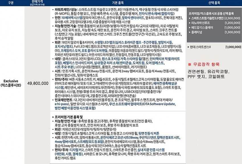 플래티넘, 헤드업 디스플레이 등 + PPF / 전면썬팅 등 (아래 옵션사항 참조)