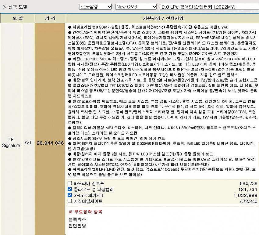 ▶ 차종 및 등급 : 르노삼성 NEW QM6 2.0 LPe / LE_시그니처 [2022MY]