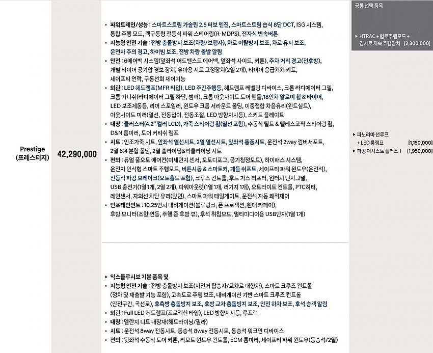 4륜 + 파킹 어시스트 플러스 1 + 파노라마 썬룹 / 블랙박스 (아래 옵션사항 참조)
