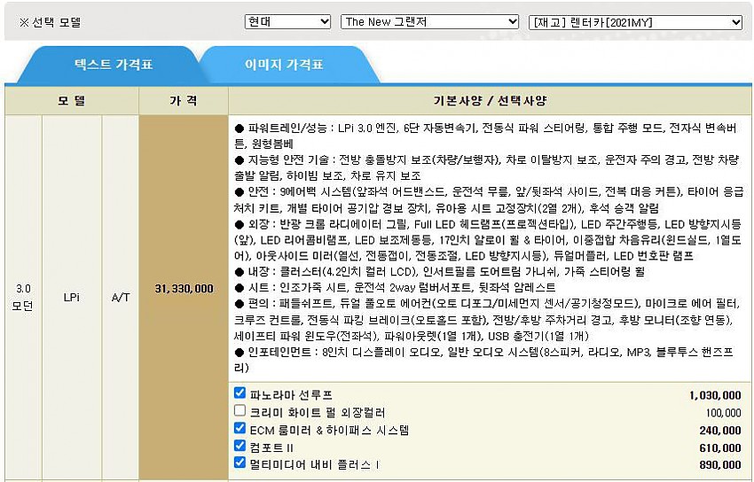 ▶ 차종 및 등급 : 그랜저 렌터카 LPG 3.0 모던 21MY