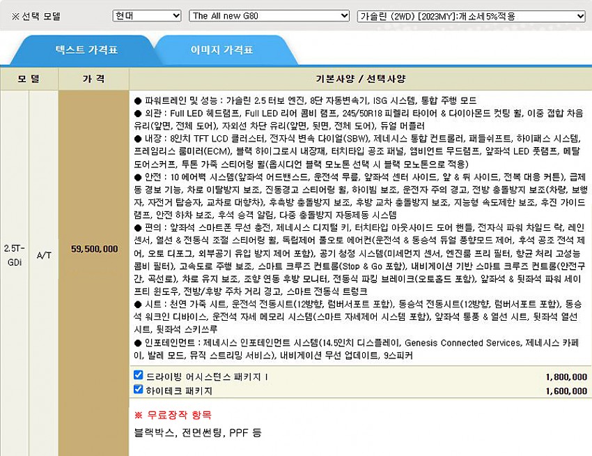 하이테크 패키지 등 + 블랙박스 / 전면썬팅 등 (아래 옵션사항 참조)