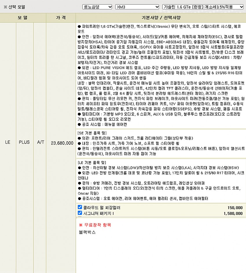 ▶ 차종 및 등급 : 르노삼성 XM3 1.6 GTe LE Plus [2021MY]