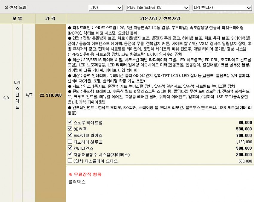 ▶ 차종 및 등급 : 기아 플레이 인터렉티브 K5 / 2.0 LPI 스탠다드 [2020MY]