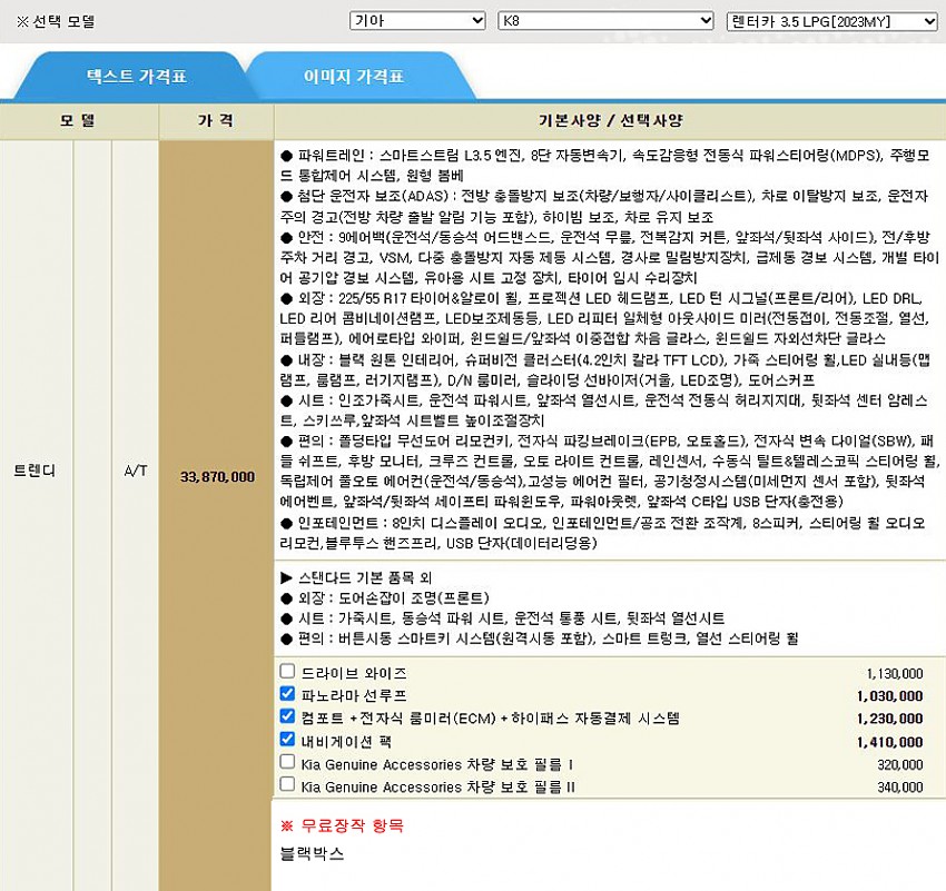 ▶ 차종 및 등급 : K8 렌터카 3.5 LPG 트렌디 (A/T 2023MY)