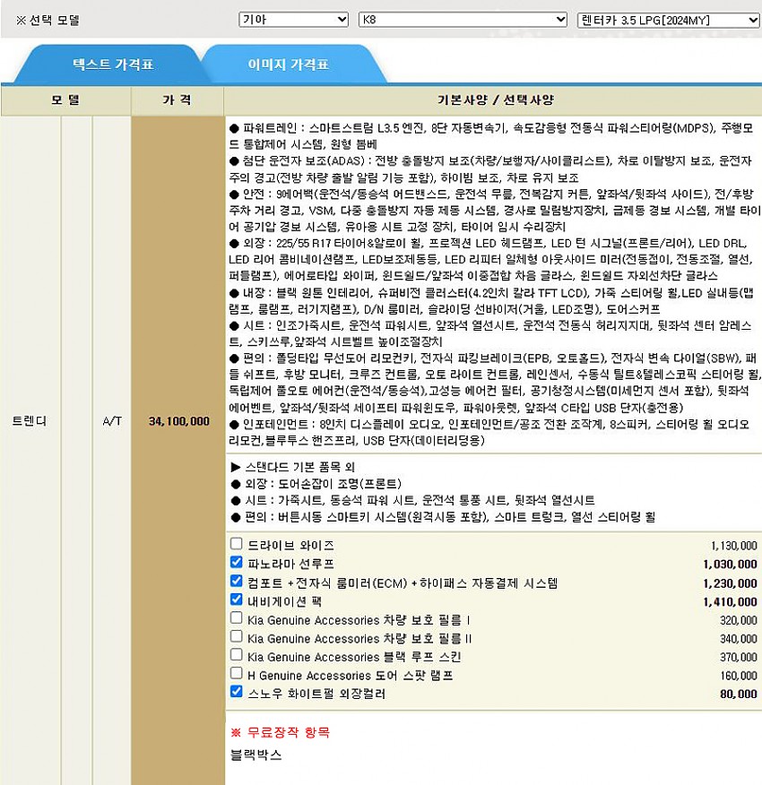 ▶ 차종 및 등급 : 기아 K8 3.5 LPG 트렌디 24MY (렌트카)