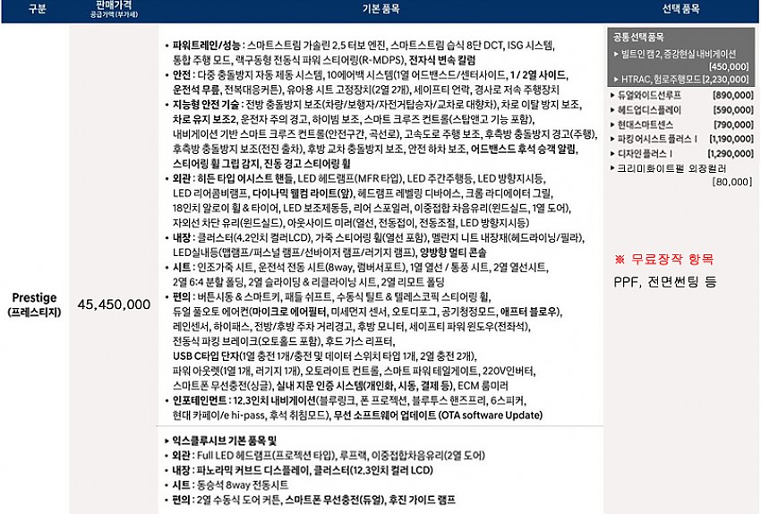 스마트센스 + 헤드업 디스플레이 등 / 전면썬팅 + PPF 등 (아래 옵션사항 참조)