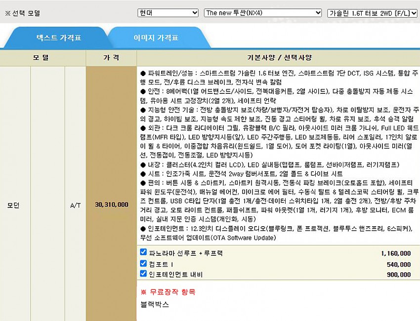 인포테인먼트 내비 + 파노라마썬루프 등 / 블랙박스 (아래 옵션사항 참조)