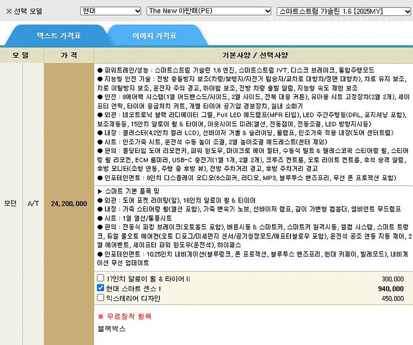▶ 차종 및 등급 : 아반떼_스마트스트림 가솔린 1.6_모던_2025MY