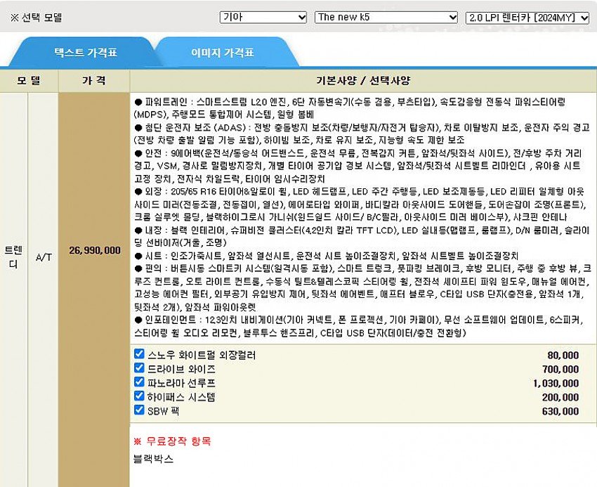 드라이브와이즈 + 파노라마 선루프 등 / 블랙박스 (아래 옵션사항 참조)