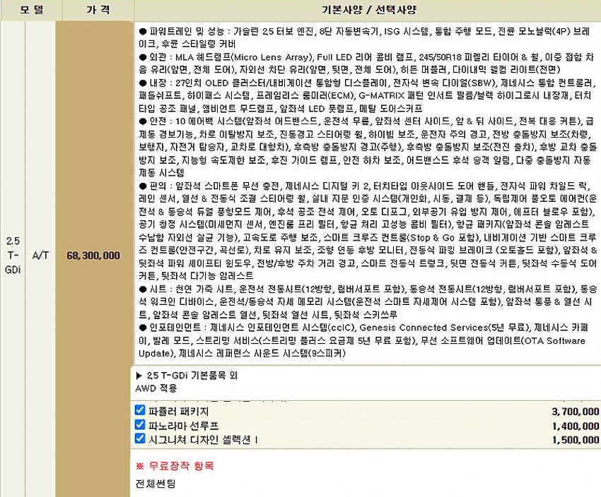 ※무상옵션 및 기본 장착 항목