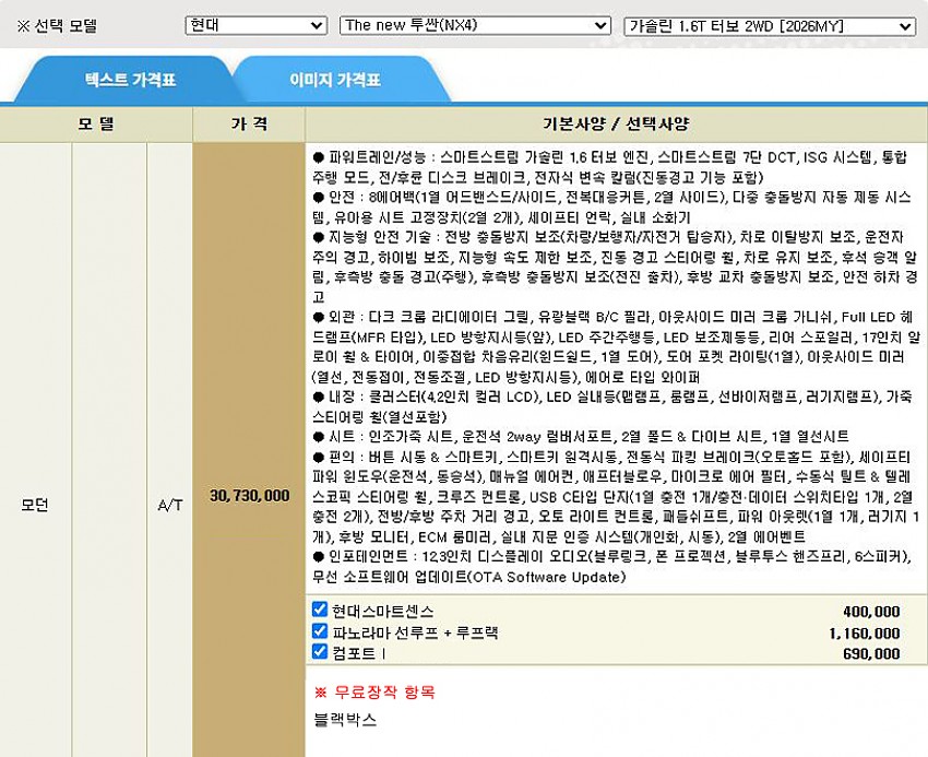 ▶ 차종 및 등급 : 현대 투싼 가솔린 1.6 터보_2WD_DCT 모던_26MY